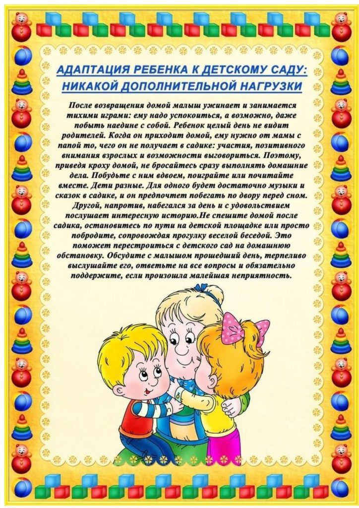 Уважаемые родители. Процесс адаптации ребенка в детском саду может протекать по-разному. Одни ребятишки скорее привыкают к изменившейся обстановке, другие же надолго беспокоят родителей негативными поведенческими реакциями. Именно по выраженности и длительности вышеперечисленных проблем и судят об успешности адаптационного процесса. В этой странице собраны материалы для ознакомления родителям, которые впервые отправляют своих детей в детский сад. Пусть адаптация детей в детском саду проходит легко и без проблем.